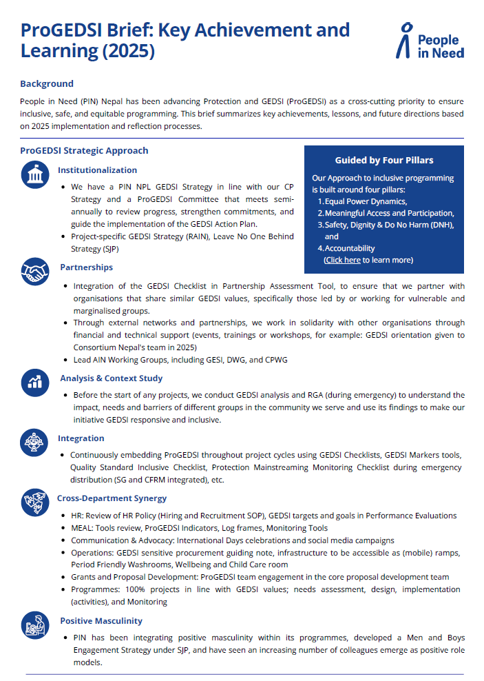 The ProGEDSI Brief 2025 highlights PIN Nepal’s key Protection and GEDSI learnings and collective achievements from 2025. It distils practical next steps shaped by our experience. Through this brief, we reaffirm our strong commitment to inclusion and equity in all our programmes and operational interventions